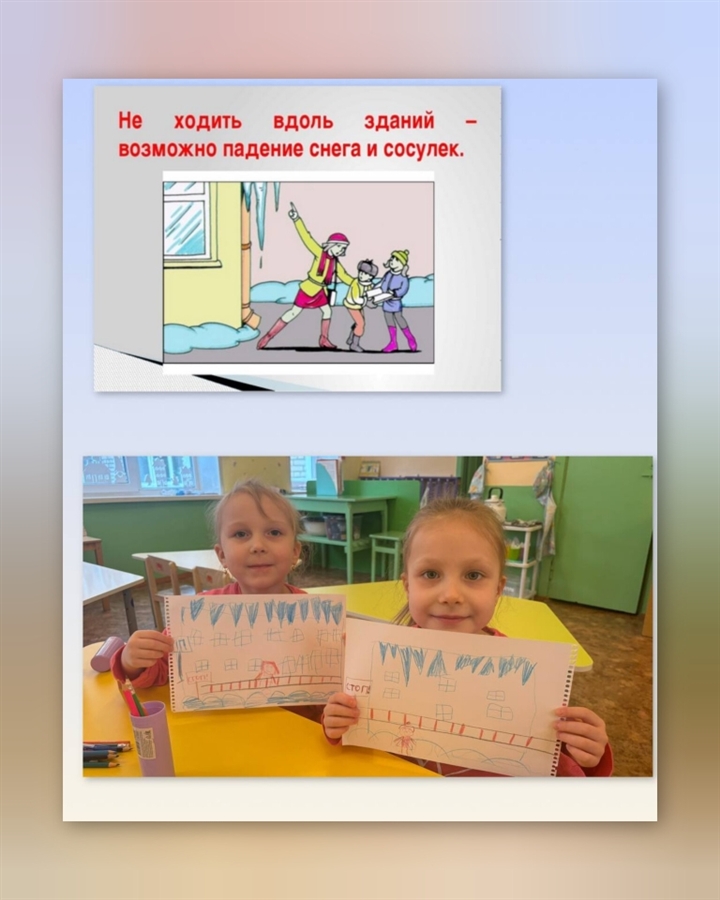 - в комнате безопасности рассматривали тематические картинки, и вместе разбирали опасные ситуации (например, «Осторожно, сосульки!» и др.);